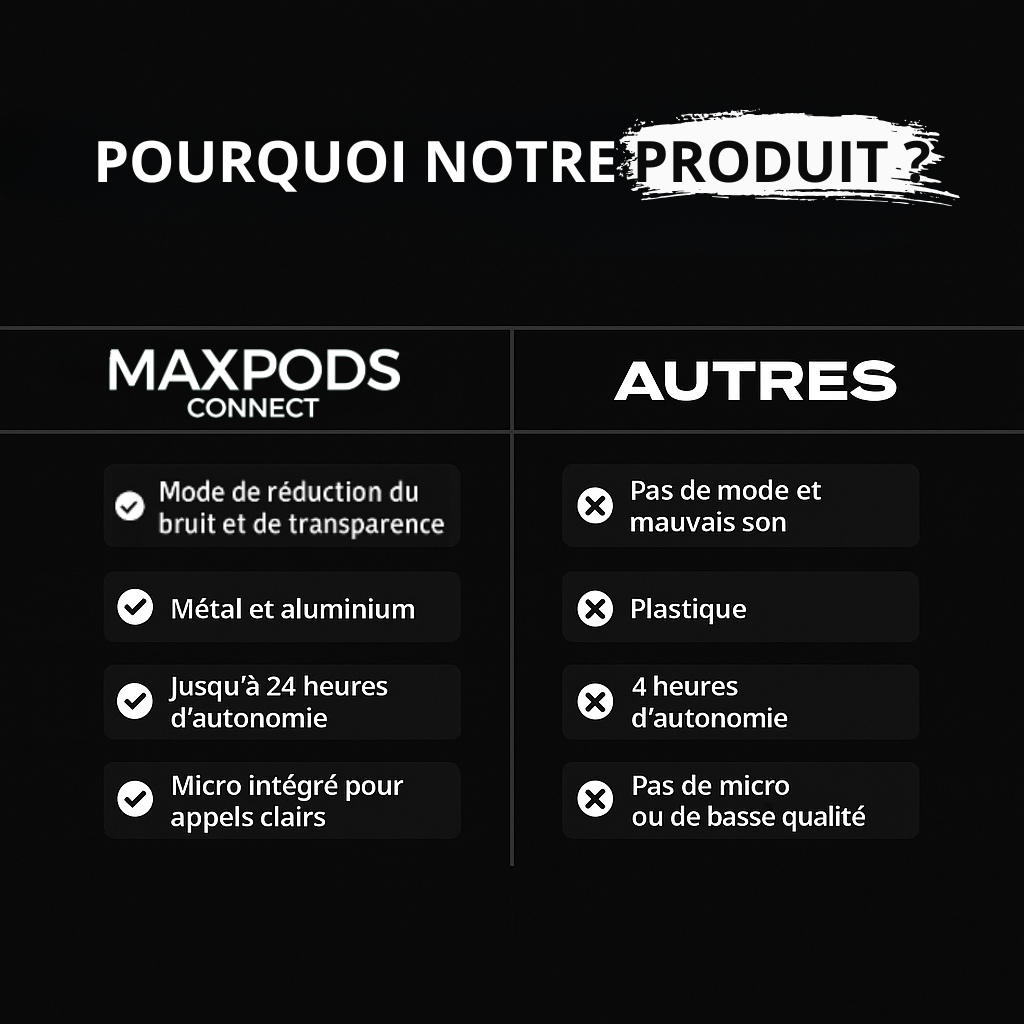 Chez Maxpods Connect, la qualité est ma priorité absolue. En tant que fondatrice, je m'engage personnellement à veiller à ce que chaque produit proposé sur notre boutique réponde aux normes les plus strictes. Notre objectif est simple : vous offrir des produits qui allient style, confort et durabilité.